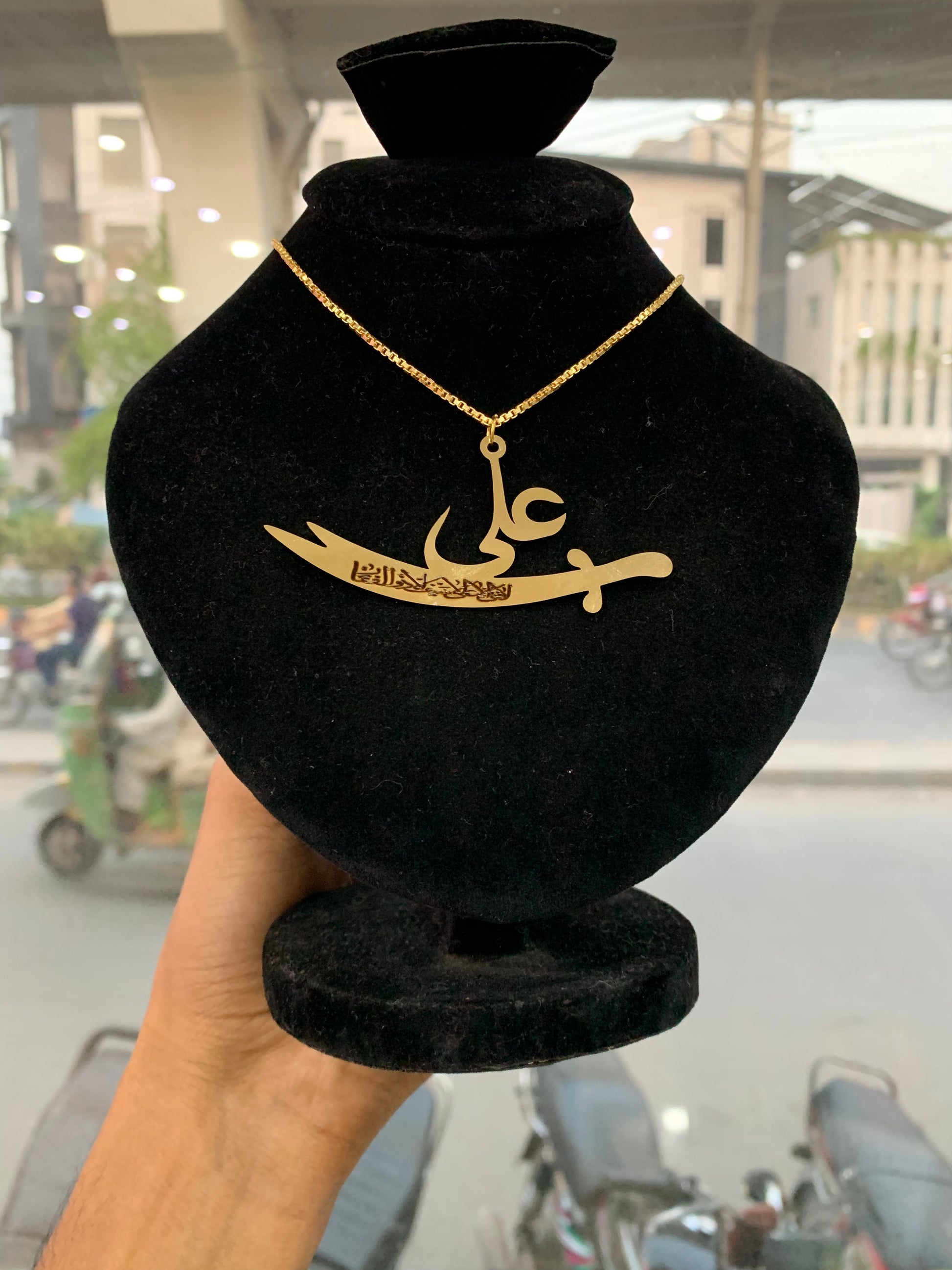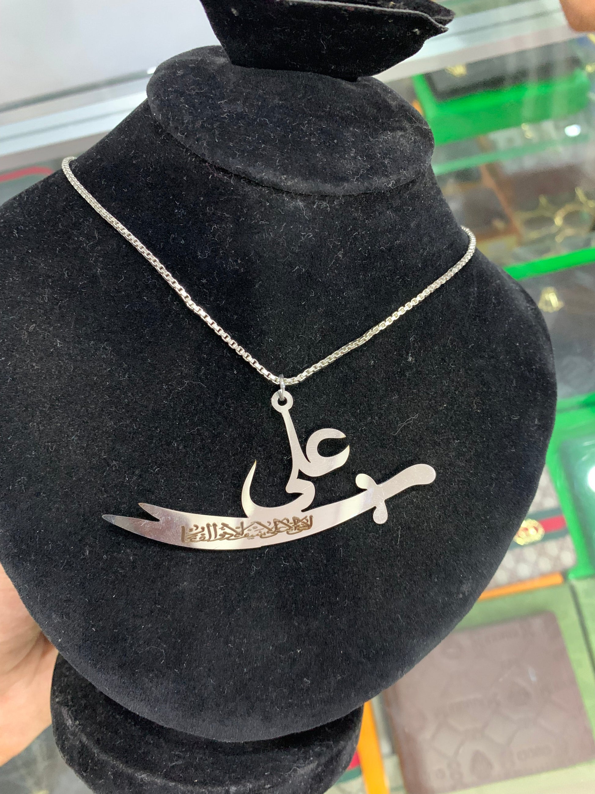 Zulfiqar Locket is based on Imam Ali's two edged sword. You can wear as pendant/necklace or hang on car mirror for charm decoration. Silvertone alloy material used for this pendant which keeps it light weight for comfortable wearing, yet giving it a premium look with fine finishing.